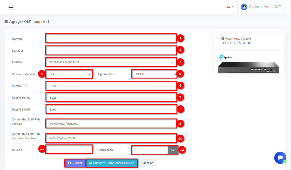 - Nombre: Se refiere a como nombrara a su OLT en el sistema AdminOLT. Este es definido por usted y no afectará a la conexión.
