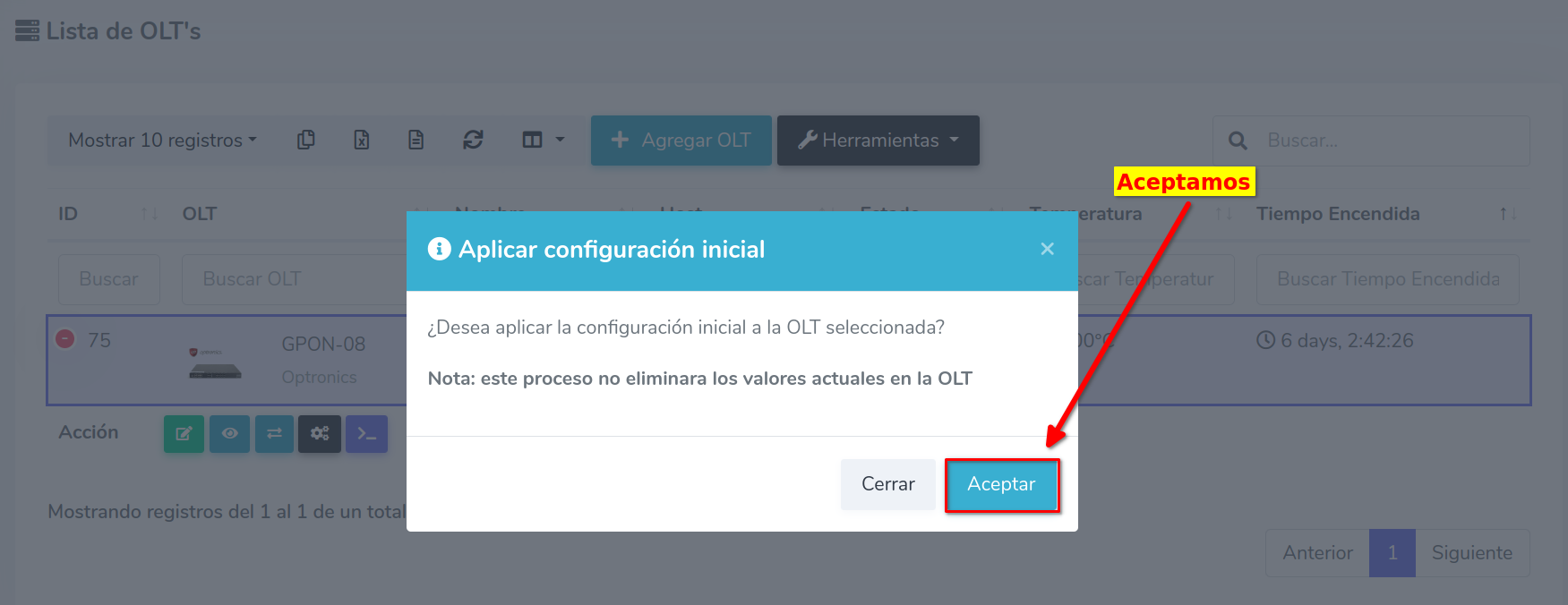Después de aplicar las configuraciones iniciales, puede demorar entre 10-20 minutos en verse reflejados en su OLT.