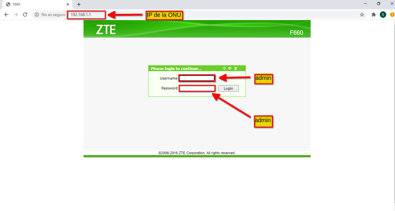 1 Accedemos al navegador y entramos a la interfaz de la ONU utilizando su IP por default 192.168.1.1