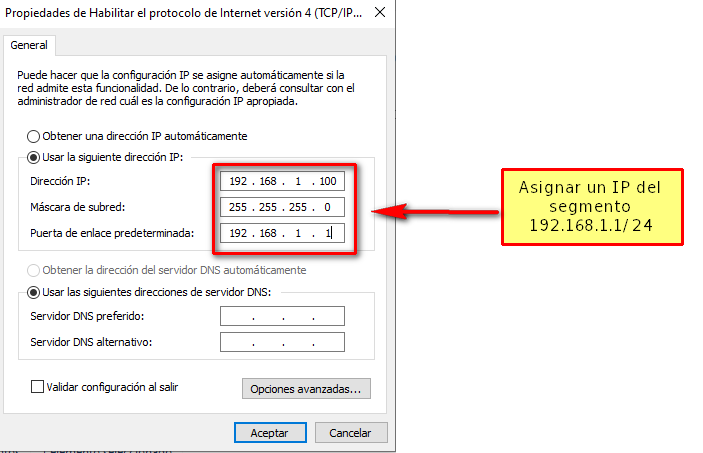 Primero debemos asignar a nuestra computadora una IP del segmento 192.168.1.0/24