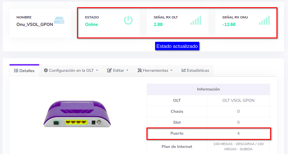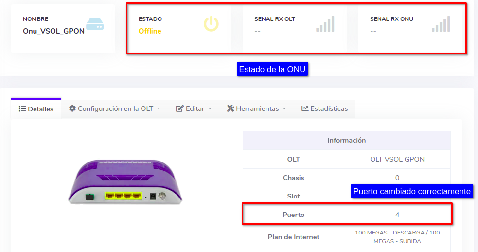 4Cambiar puerto físicamente y verificar el estado de la ONU
