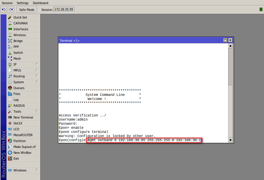 Epon(config)# mgmt outband 0 192.168.30.85 255.255.255.0 192.168.30.1