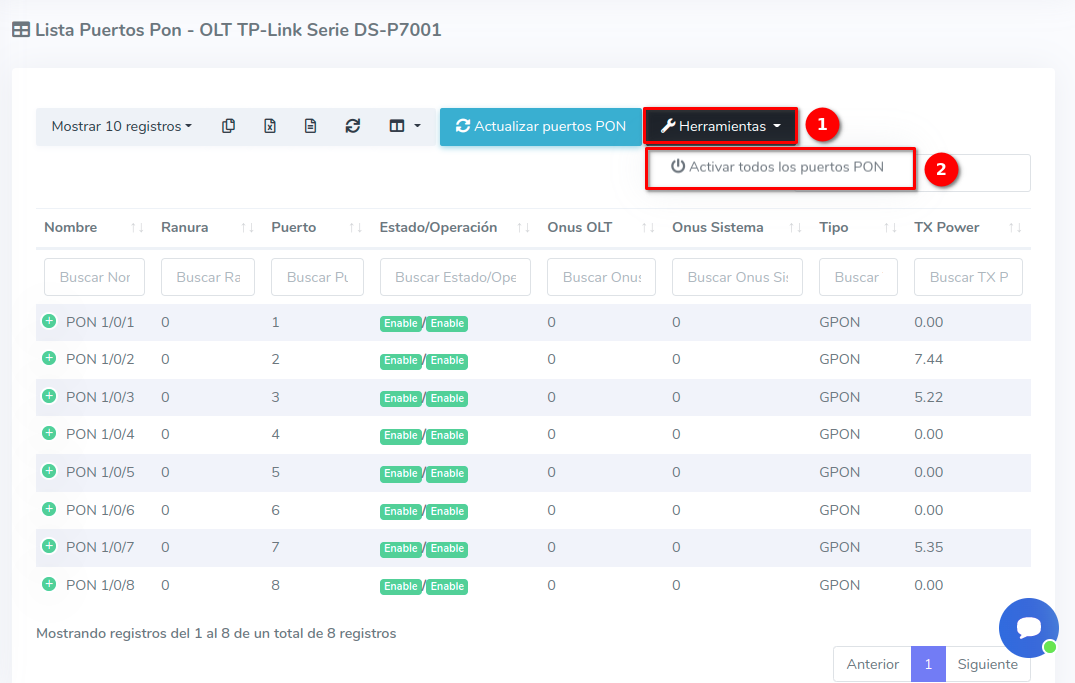 2 Estando en esta vista seleccionamos la opción Activar todos los puertos PON.