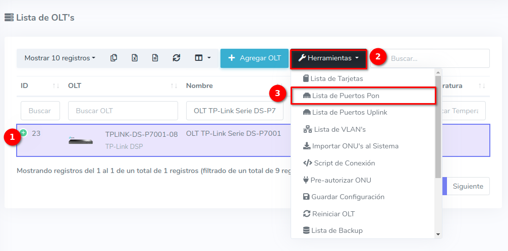 1 Ir a Lista de Puertos PON de nuestra OLT