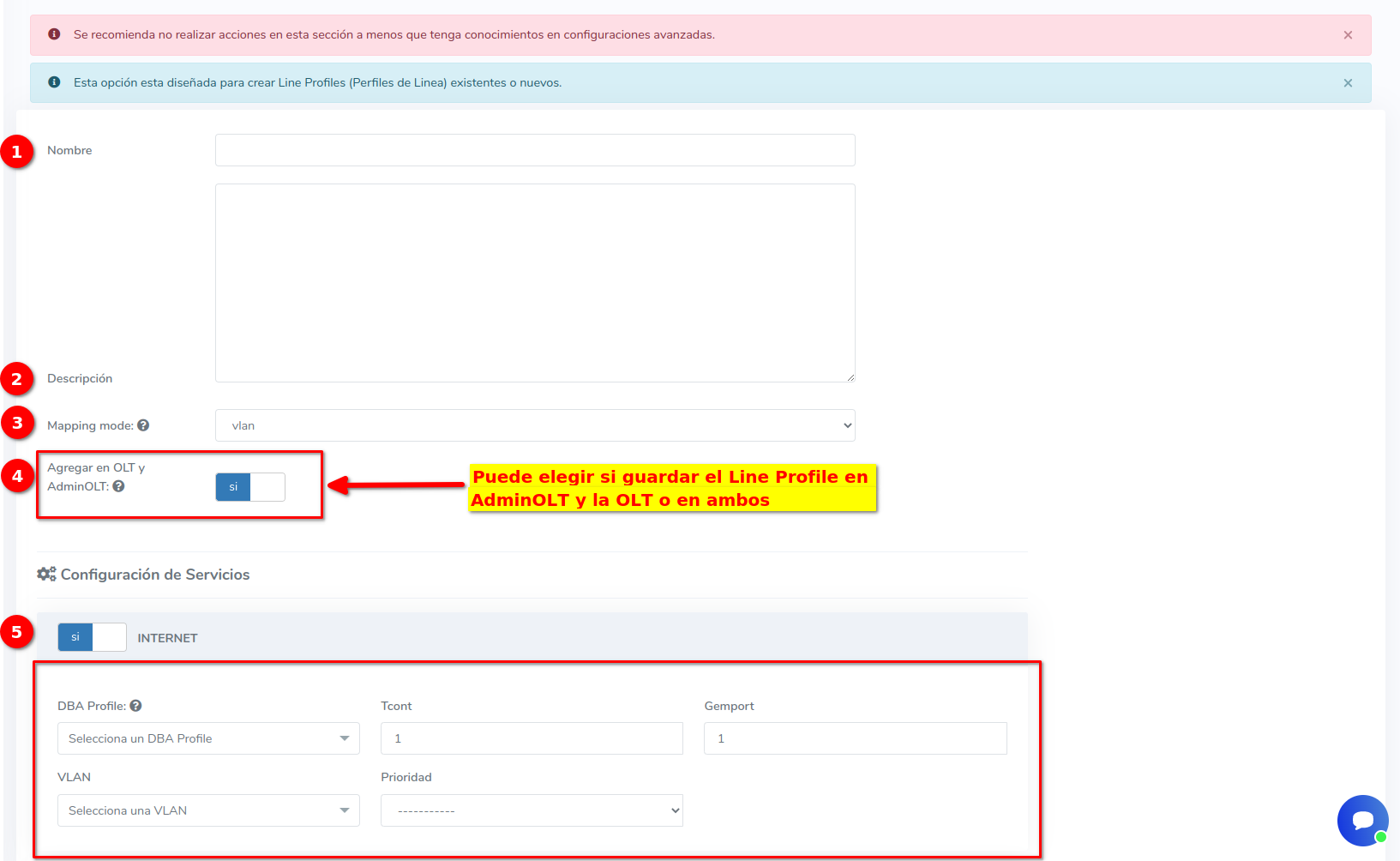 AdminOLT ha integrado una característica para crear configuraciones avanzadas de perfiles de línea, para que los usuarios puedan autorizar sus onus utilizando configuraciones personalizadas y no de la manera predeterminada realizada por AdminOLT.