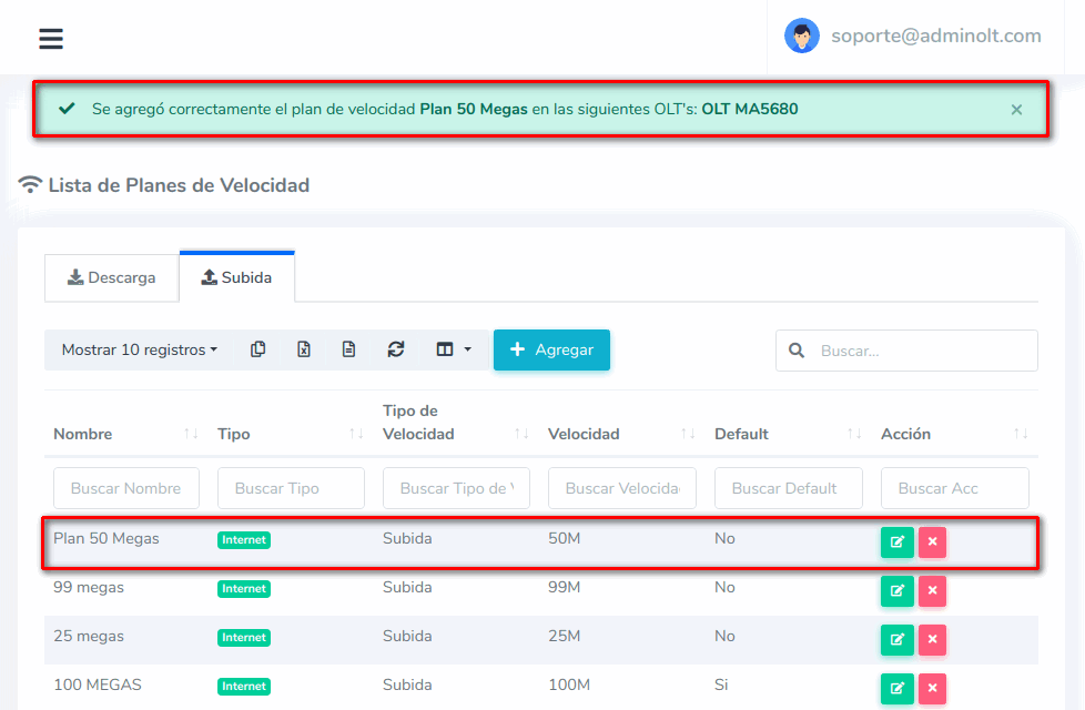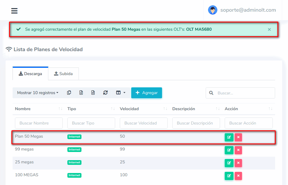 4 Una vez hayamos guardado la información AdminOLT se conectara con la OLT y agregara el Plan de Velocidad
