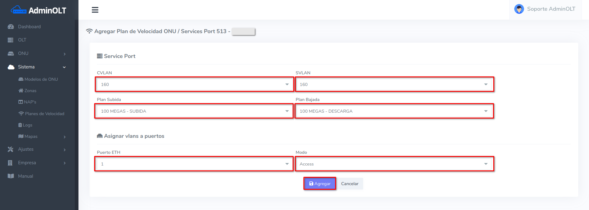 4 Seleccione una CVLAN y una SVLAN de las vlan's asignadas en la OLT, un plan de subida, de bajada, el puerto a donde ira dirigida esa vlan y en que modo modo.