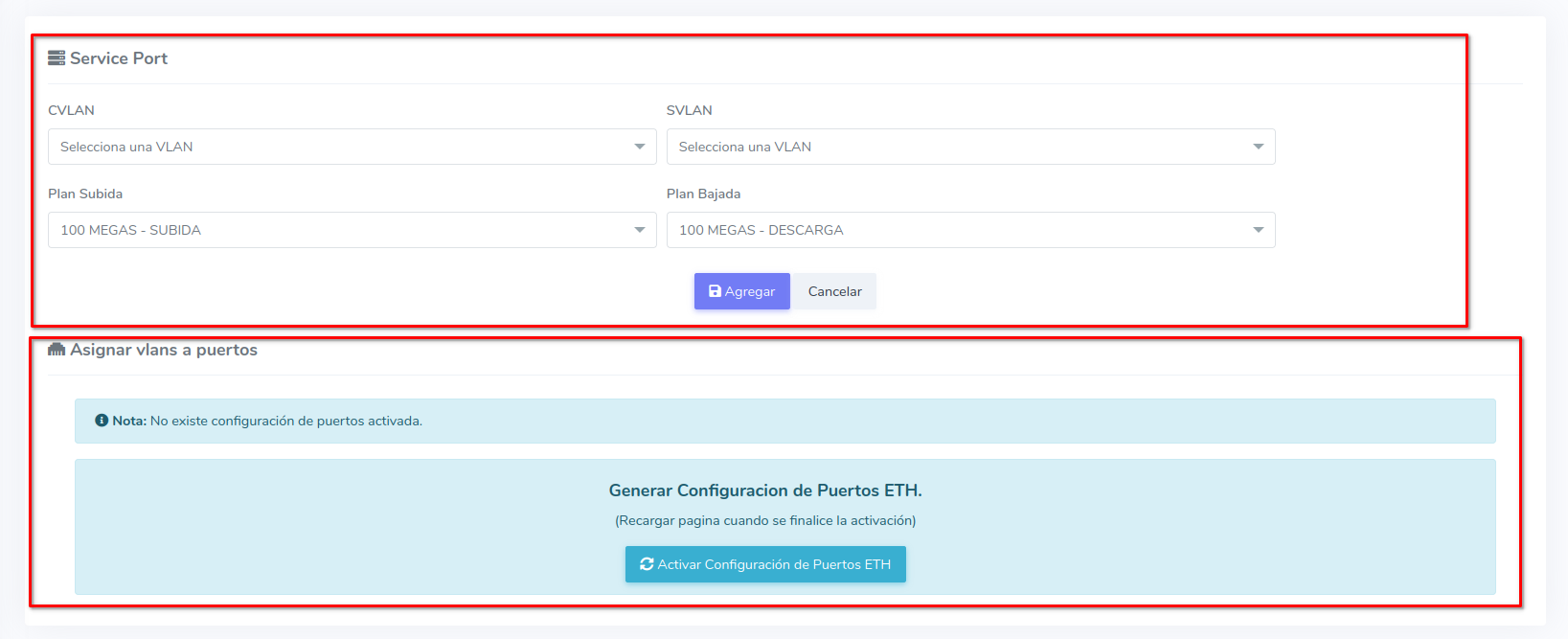 3 Dar clic en Activar Configuración de Puertos ETH y recargar pagina cuando haya finalizado la activación.
