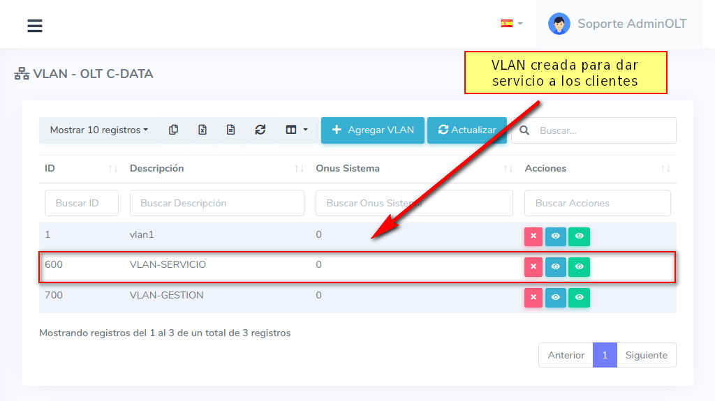 2 Después de agregar esta vlan en tu router, podremos agregarla en la OLT desde la Lista de OLT's seleccionando la OLT y la opción Lista de VLAN's.