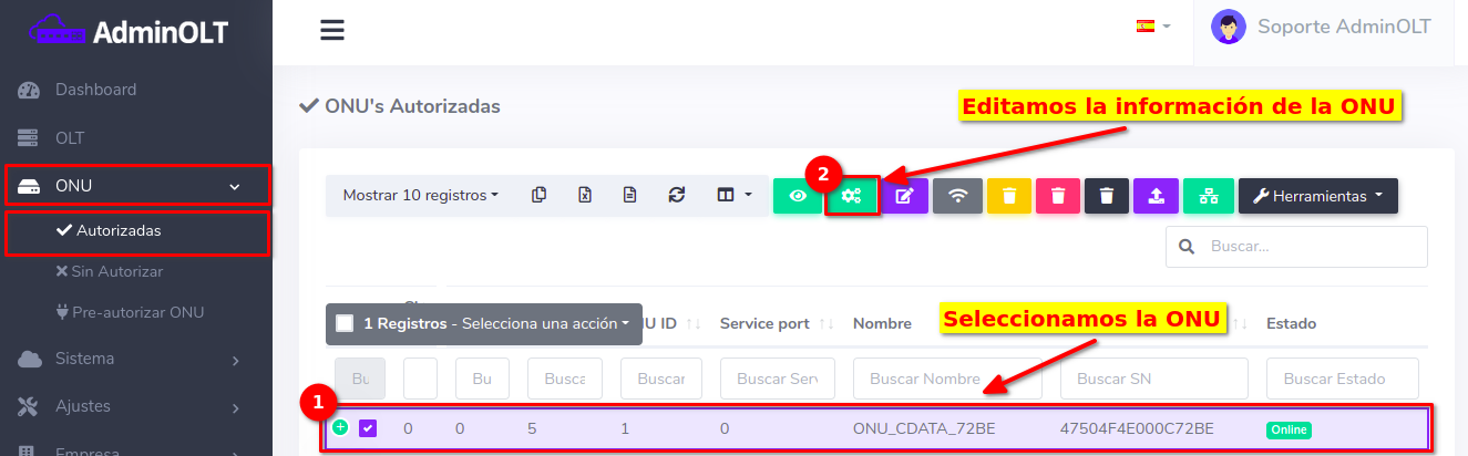 Pasos para editar información de ONU Autorizada en AdminOLT