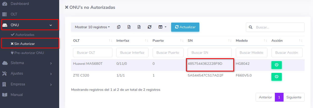 En AdminOLT podemos editar información de una ONU Autorizada en la OLT, supongamos que alguna de las ONUs que tenemos autorizadas en el sistema se estropea. Tomaremos como ejemplo esta situacion para explicar el propósito de esta función. Asi que en ese caso en AdminOLT al editar ONU por SN podemos tomar información de alguna ONU no Autorizada y usarla, sin perder la configuración inicial que teníamos.