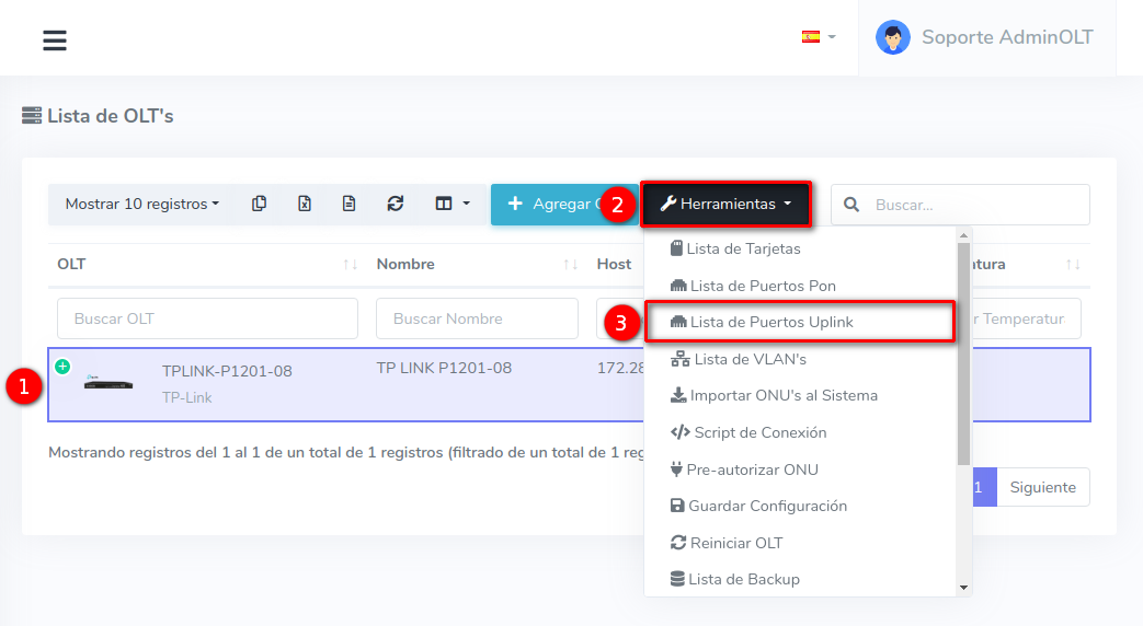 1 En la Lista OLT's seleccionamos el equipo con el que trabajaremos para después ir a Puertos Uplink, que se encuentra en el botón con la leyenda Herramientas.