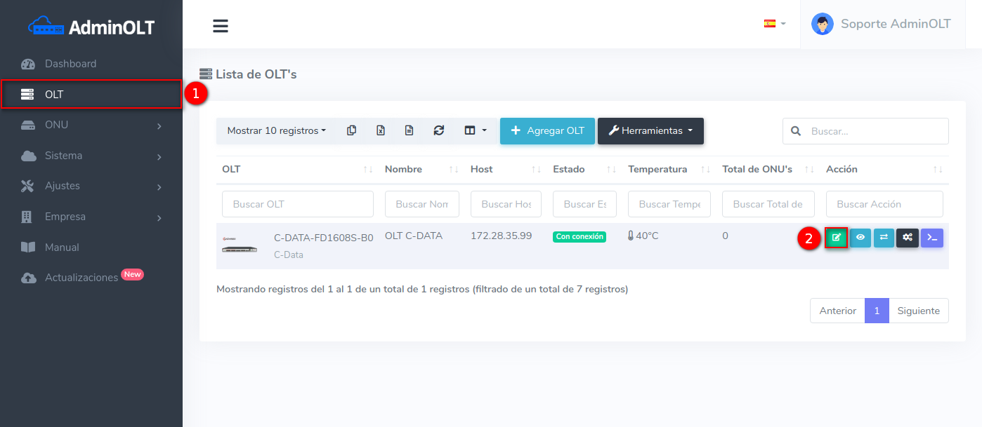 1 Para poder establecer la conexión de manera exitosa es necesario que generemos un script, para poder generarlo, nos dirigimos a nuestra OLT y seleccionamos la opción de editar.