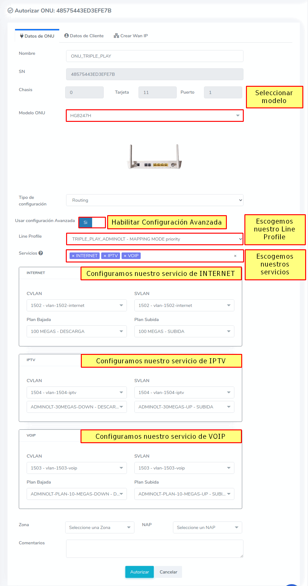 Autorizamos la onu y habilitamos la opción de configuración avanzada