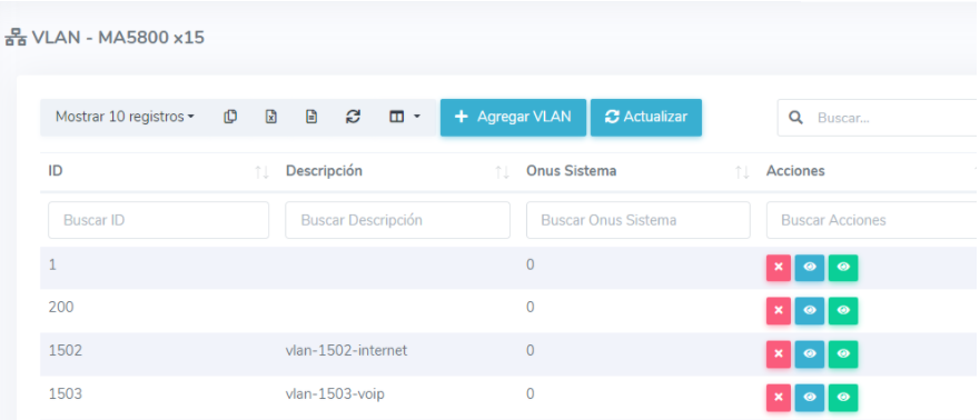 Una vez creadas las VLAN en el router, es necesario que las creemos en la OLT. Nos dirigimos a Lista de OLT, seleccionamos Herramientas y en la opción Lista de VLAN vamos a crear esas mismas VLAN.