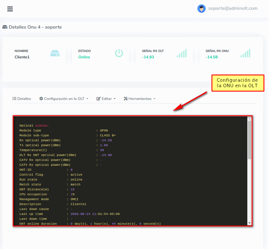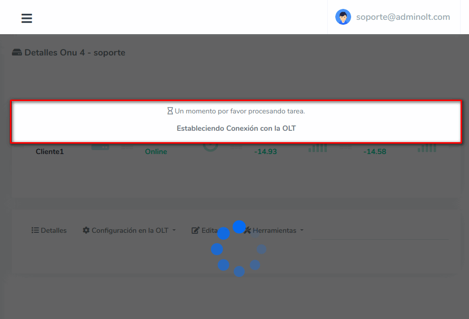 4 Esperamos que AdminOLT se conecte con la OLT y traiga la Configuración de la ONU.